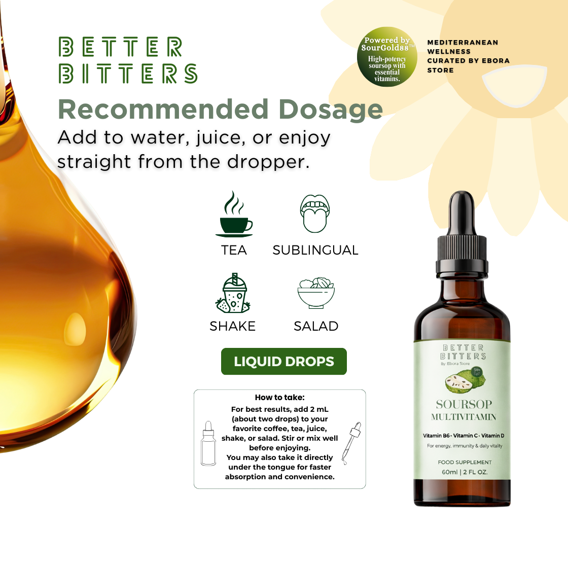 Discover the natural vitality of soursop with Soursop Multivitamin Drops, featuring SourGold88™ — our signature soursop extract standardized for consistent potency and nutrient preservation.